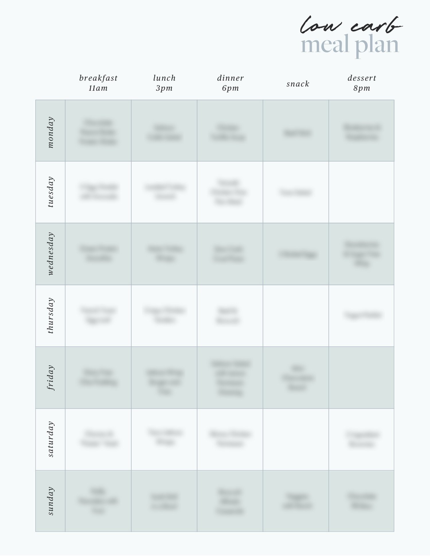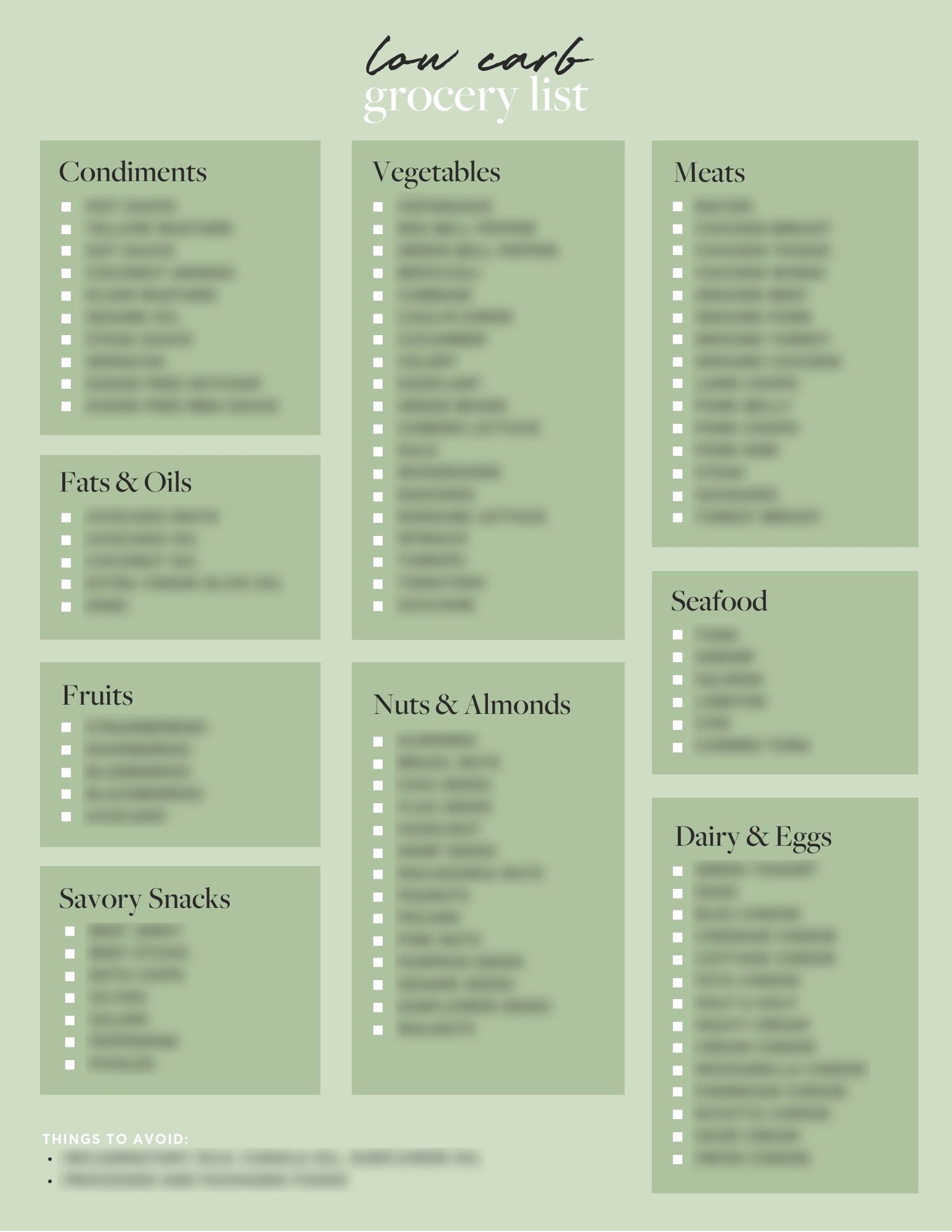 - A comprehensive low carb grocery list that you can have on hand and bring shopping with you